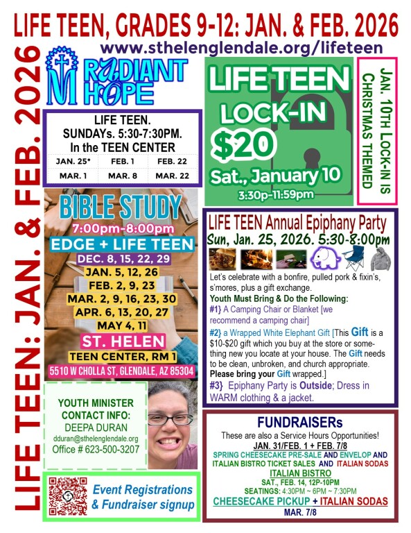 Registration your 9th-12th grade youth for LIFE TEEN or please contact Deepa Duran .